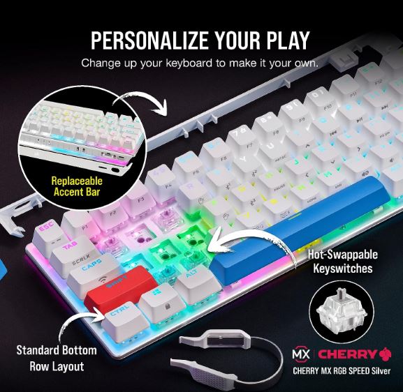 The CORSAIR K70 PRO MINI WIRELESS RGB White PBT Keys 60% Mechanical Gaming Keyboard is big on both performance and customization, connecting with hyper-fast, sub-1ms SLIPSTREAM WIRELESS, Bluetooth®, or USB. CHERRY MX SPEED mechanical keyswitches are easily swappable with any MX-compatible switches for a customized gaming and typing experience, topped by durable PBT DOUBLE-SHOT PRO keycaps.